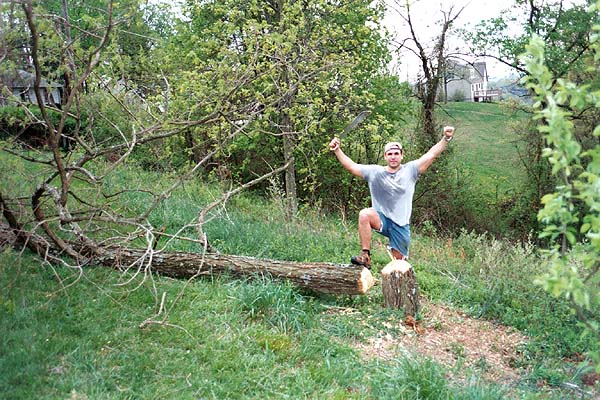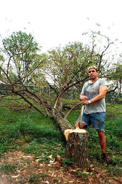 I decided that it might be fun to chop the tree down manually -- perhaps it's a guy thing, but there's something enjoyable about felling timber. Perhaps it is the inflated sense of importance that comes from bringing down something so large with your hands. Perhaps it's a throwback to the satisfaction of living "off of the land." Regardless, I decided to give it a shot, and asked my brother if he had an axe that I could use to chop the locust tree down.