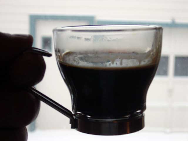 The moment of truth arrived with all the delicacy of a freight train. I lifted the level on the espresso machine, and brought it down like a guillotine, and the first blood from my concoction oozed out of the machine. It was black as night, and I half expected it to eat through the glass as it poured into it like syrup from hell.