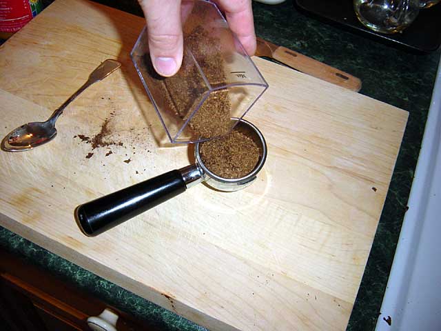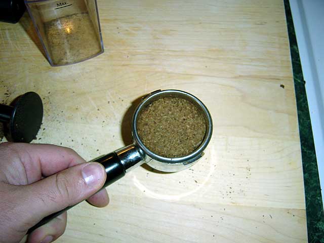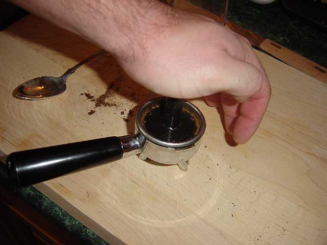 Already the room was filled with the smell of tobacco, and I was smiling with glee as my evil plot was unfolding with perfect precision. The next step in making an expresso is to compress the grinds into a cake, so that it the hot steam from the espresso machine is properly forced through it.