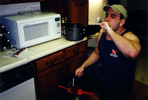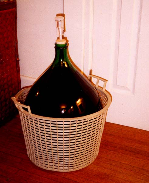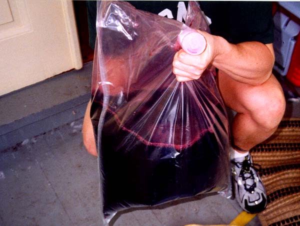 2/4/2001 -- 1:30am -- Amazingly, all of the pouring/mixing went smoothly -- I've got 10 gallons of cabernet sauvignon grape juice in a "carboy" sitting in my bedroom. I then mixed the yeast culture up in warm water, and added it to the juice, putting a cotton ball in the mouth of the container to let it breathe, but keep dust and other contaminants out. The yeast eats the sugar in the grape juice, converting it to alcohol in the process -- all I do now is wait for 3-5 days until the "violent fermentation" stops (the frothing/bubbles die down).