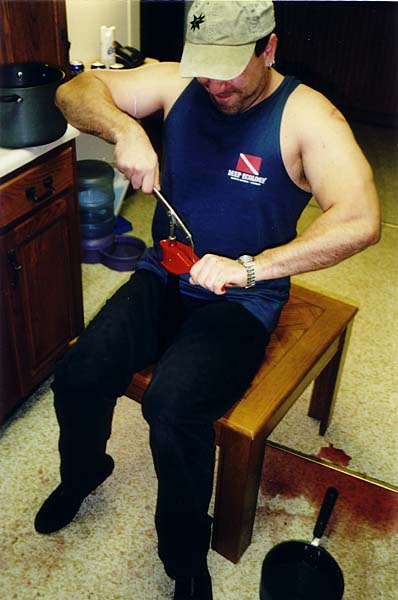 I then dragged everything into the kitchen, and proceeded to make a huge mess. I siphoned the wine from the oak barrel it had been aging in into each bottle -- to stem the flow of wine while it went from one bottle to another, I drank the excess. By the time I was on bottle 30 or so, I realized I was quite drunk.