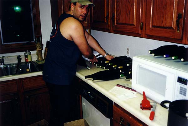 12/23/2001 -- 8:30pm -- The time has arrived, a scant few days before Christmas! I had my friends save their wine bottles as they drank them -- thankfully with my friends, it didn't take long to accumulate the 40 or so bottles I'd need for my wine. I ended up filling up my tub with soap and hot water, then letting the bottles sit in it overnight to get the labels off (much to the chagrin of my roommate, who wanted to shower).